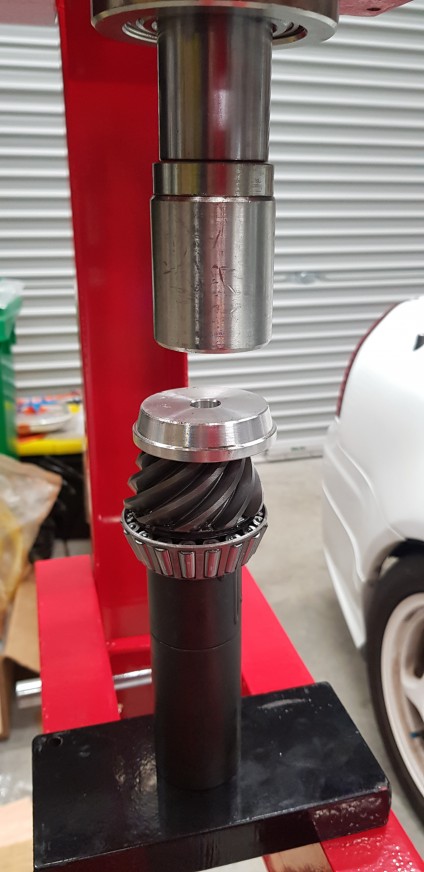 Next, new bearings need to be pressed onto the diff locker housing. This is done with a shop press and the correct diameter pipe or some bearing press dies. I achieved this using a combination of some dies that came with my ball joint remover/press. Make sure you do not apply pressure to the bearing cage when pressing, otherwise you will damage the bearing and you'll need to purchase a new one.