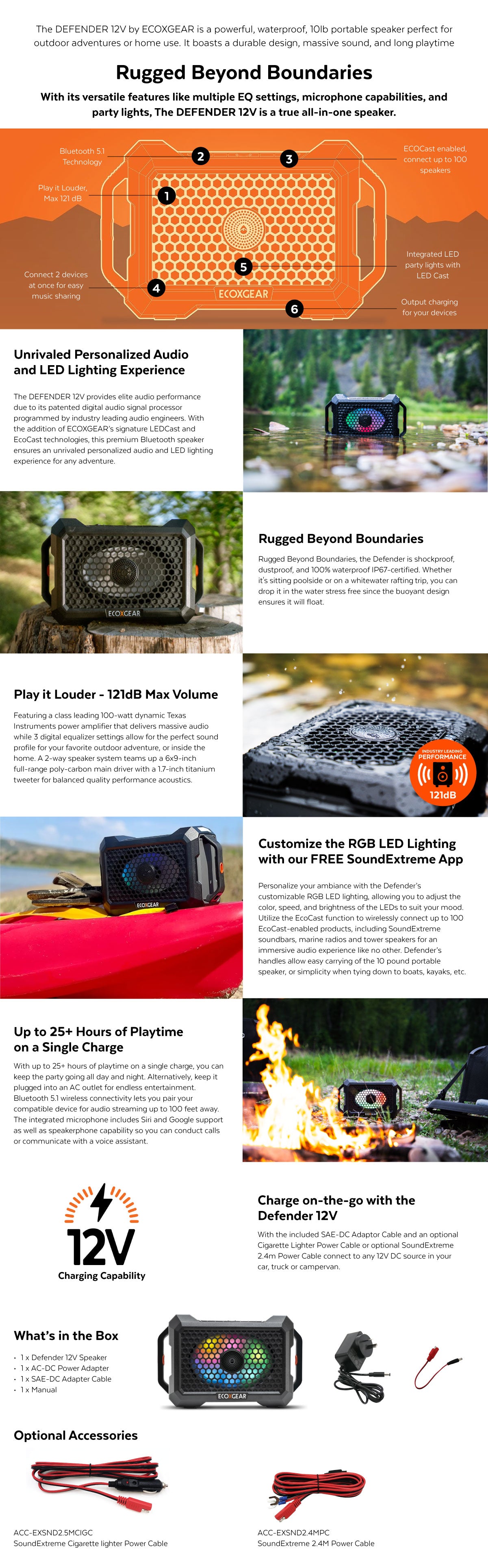 The ECOXGEAR DEFENDER 12V is a rugged, waterproof powerhouse. Delivering massive sound with deep bass, this 100W speaker is built for adventure. Enjoy up to 25 hours of playtime, customizable EQ settings, and vibrant LED lights. With features like hands-free calling, a built-in microphone, and the ability to connect multiple speakers, the DEFENDER is your ultimate outdoor audio companion with 12V Charging Capability.